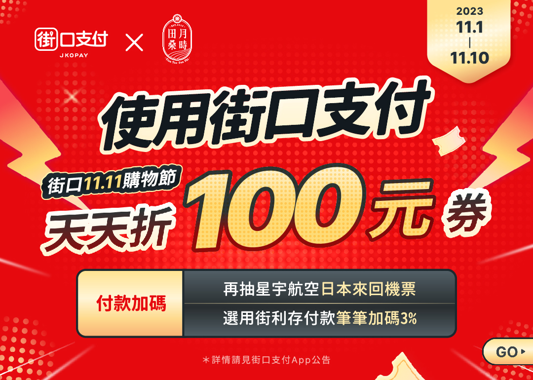 活動辦法:於街口支付App活動頁領取每日「雙11電商神券」共計10張(每日一張),單筆消費滿 1,500元 可折抵 100元,該券適用街口支付指定「全電商品牌」。